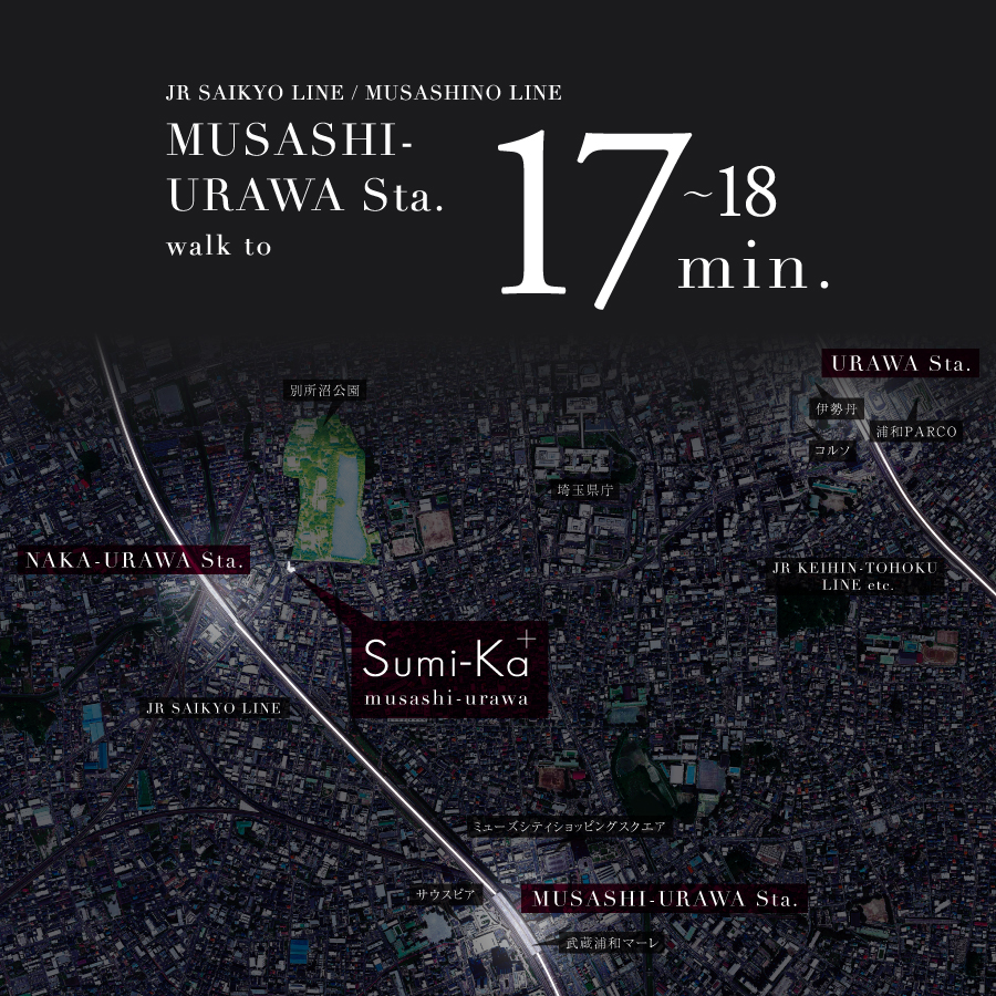 利便性を擁する武蔵浦和エリアを生活圏としながら、「中浦和」駅へも徒歩4分の立地です。