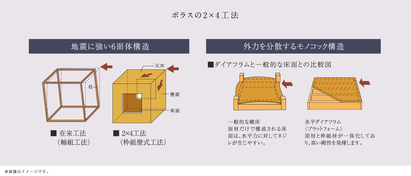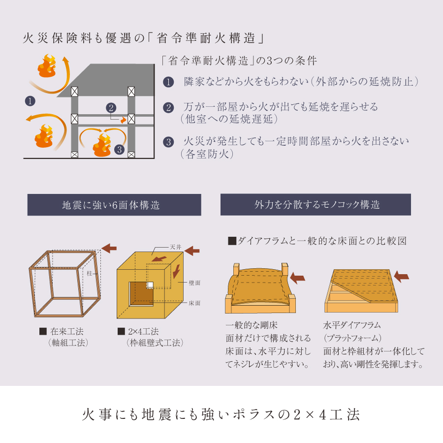 当分譲地は、火災にも地震にも強いポラスの2×4工法を用いた住まいです。
