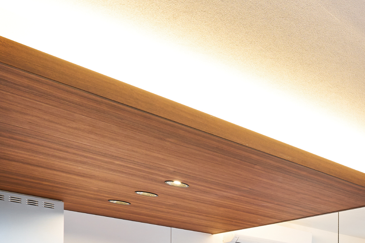 リビング天井の調光機能付きダウンライトは、3つの色温度をカンタン切替え可能。気分やシチュエーションにあわせて気軽に照明の模様替えができます。