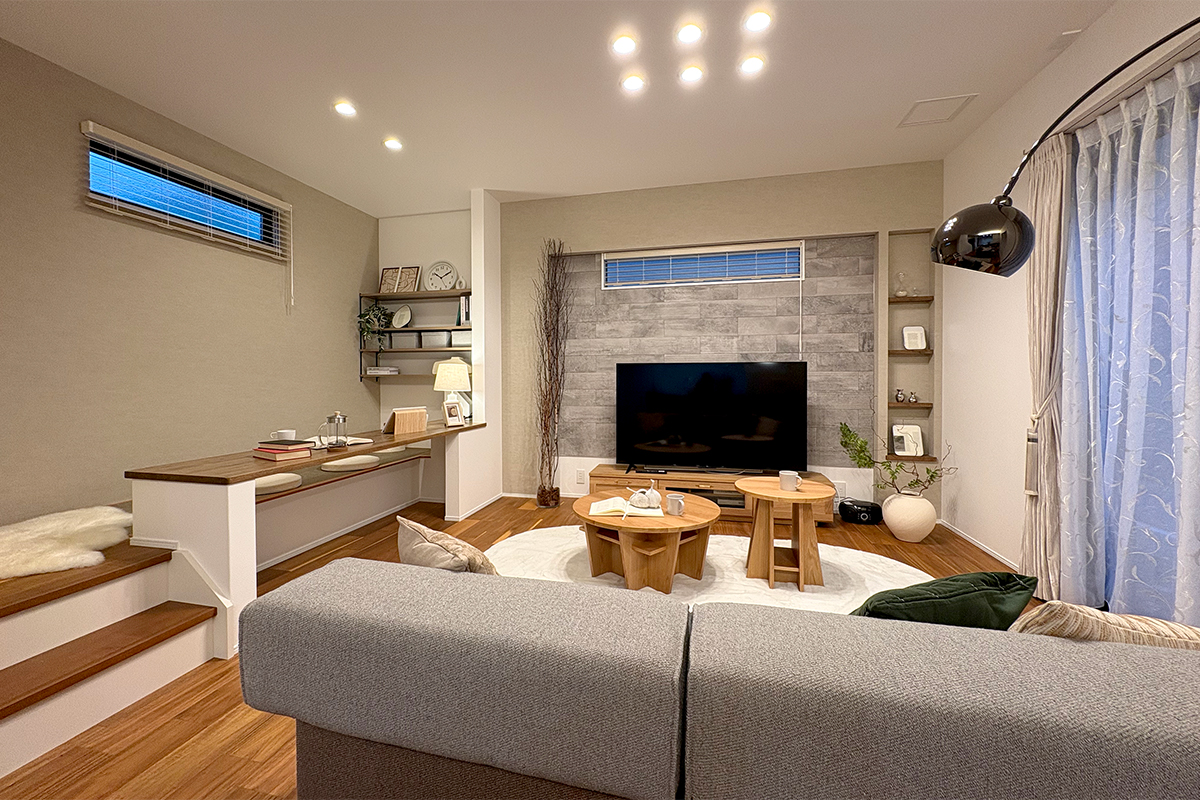 リビングのテレビ面にはアクセントパネル「エコカラット+」を採用しました。調湿・脱臭効果を兼ね備え、上質で落ち着きのある空間を演出します。