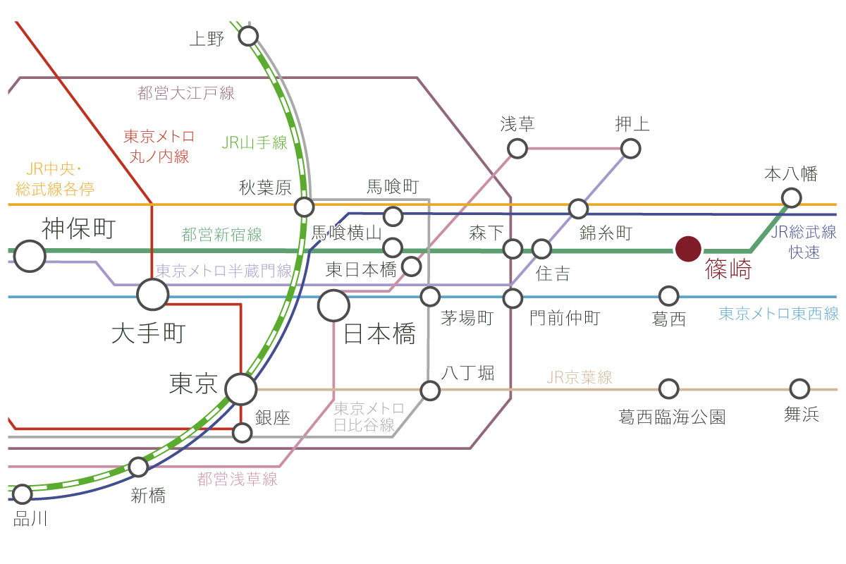 アクセス ●篠崎駅より神保町駅まで【ラッシュ時: 28分 都営新宿線各停(笹塚行)利用。】【平常時: 23分 都営新宿線各停(笹塚行)利用。大島(東京)駅で都営新宿線急行(笹塚行)に乗換。】