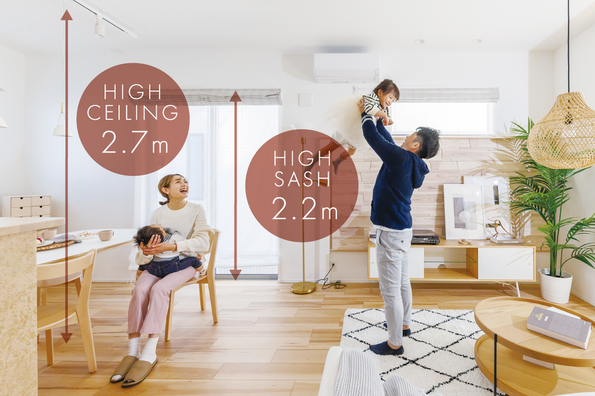 リビングの天井高を2.7m、リビングの掃き出し窓の高さを床から2.2mに設定。陽光を豊かに採り込み、明るく広がりのある団らん空間を創出します。※一部天井が下がる場合がございます。