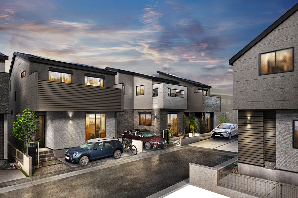 暗くなるとLED照明が自動点灯。夜の街並みを美しく浮かび上がらせます。あたたかな灯かりがともる我が家を見た時のやすらぎを日常的に味わえると同時に、家を明るく照らすことで、安全性を高める効果も。家族の安心にもつながる工夫です。※照明の数や種類は号棟により異なります。