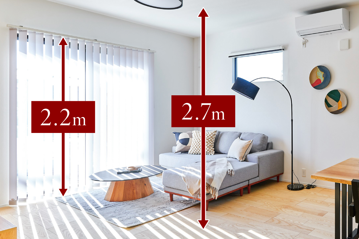リビングの天井高を2.7m、リビングの掃き出し窓の高さを床から2.2mに設定。陽光を豊かに採り込み、明るく広がりのある団らん空間を創出します。※一部天井が下がる場合がございます。