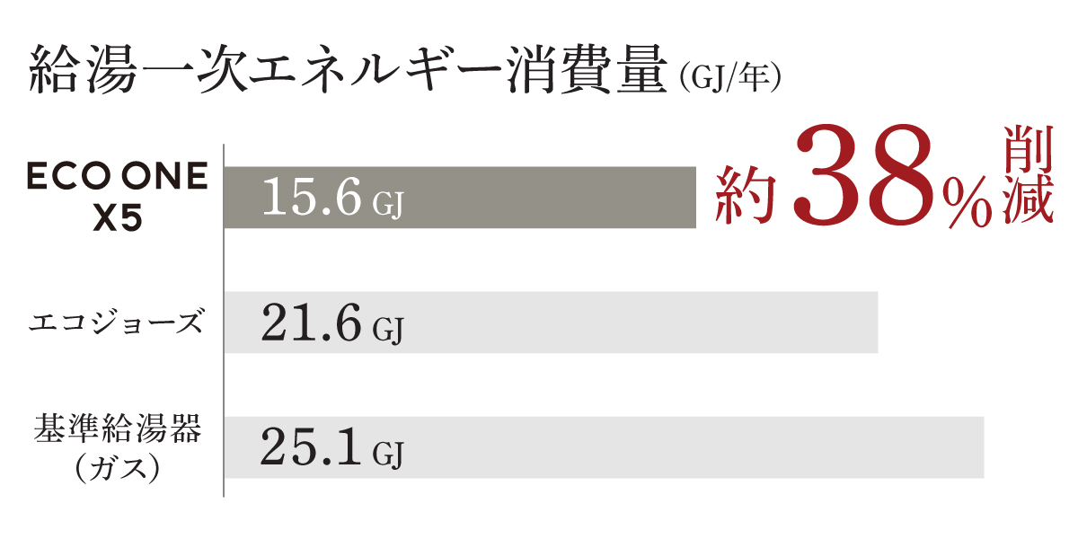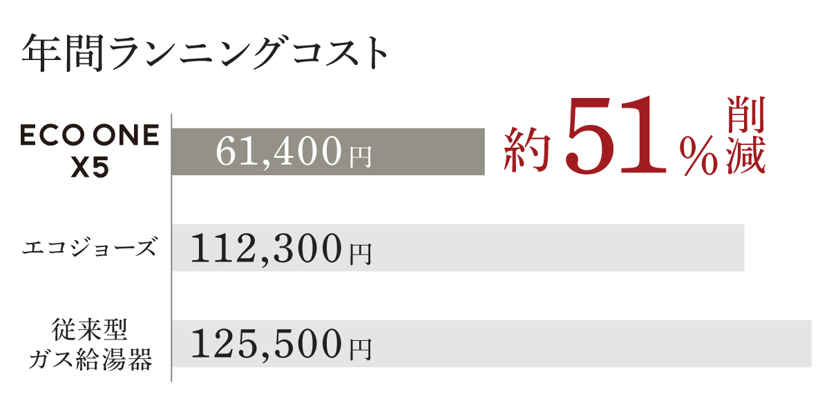 ガスと電気のハイブリッドで高い省エネ性を実現。従来型ガス給湯器と比べて年間ランニングコストを約6.4万円削減します。