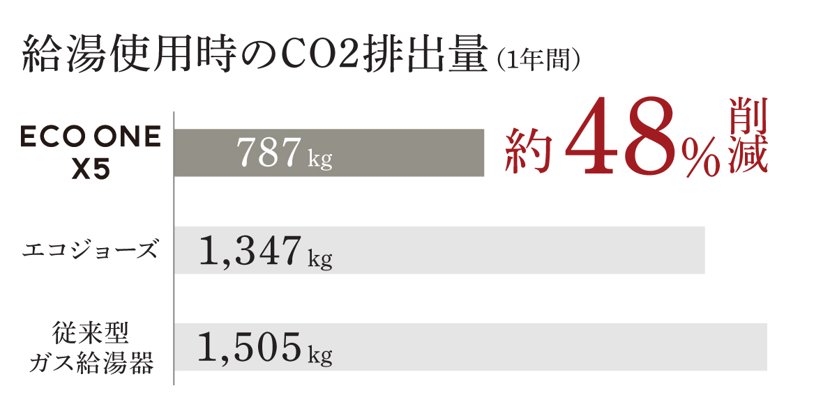 2050年のカーボンニュートラル実現へ。地球環境にやさしい『ECO ONE X5』は、従来のガス給湯器に比べ、CO2排出量を約48%削減します。
