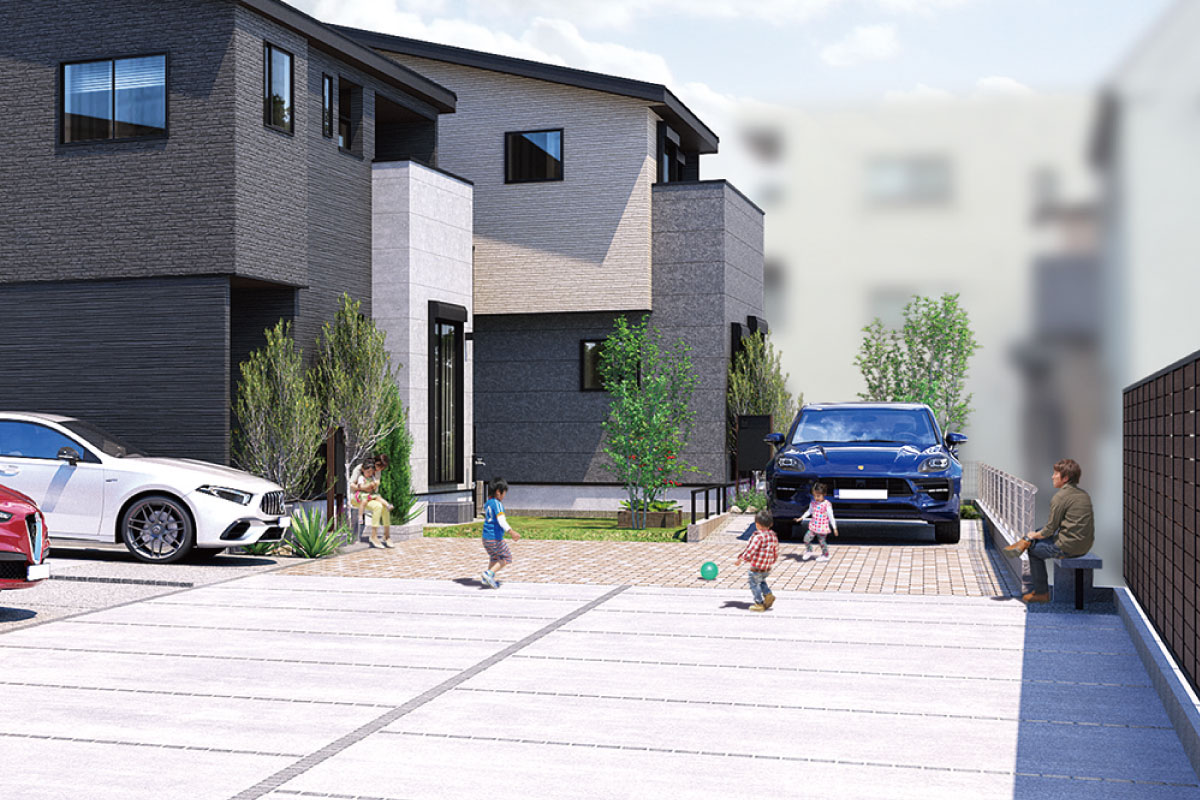 街区内に協定通路の〈心路・ココロジ〉を設けました。協定通路は通り抜けできない安全性に加え、ワンエントランスとしたことで視認性も向上。