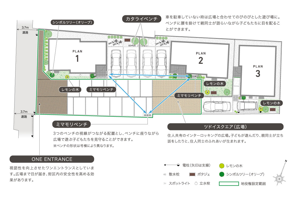 広場、ベンチ、ポタジェのある街づくりと、プラスαな空間や可変する間取りといった住まいづくりに様々な工夫を盛り込んでいます。