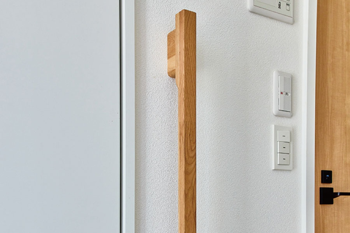 玄関には銘木の質感を活かした高級感としっかり握ることができる安全性にこだわったデザインの手摺を設置しています。