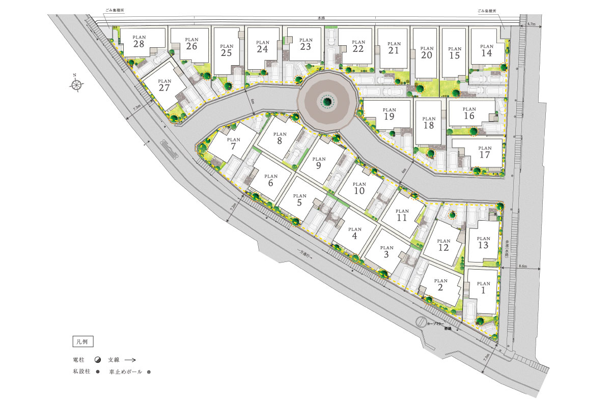 シンボルツリーがグリーンのアクセントを添え、緑豊かな街並みを演出しています。年月と共に家族が成長し、家も味わいを増していく中で、木々も一緒に成長する楽しみがあります。