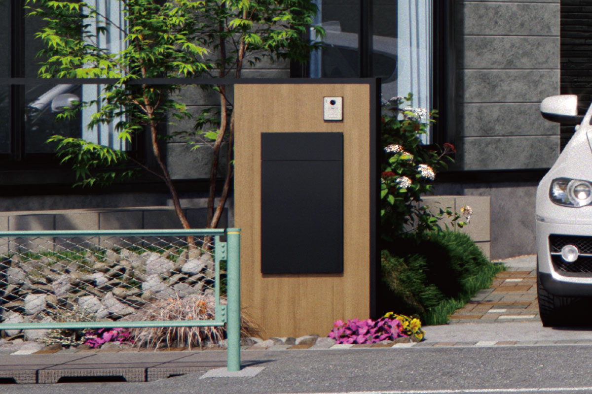 宅配ボックス・ポスト・TV ホンをまとめてシンプルなエントランスに。留守の間も荷物が受け取れる、宅配ボックス付の門柱です。※号棟によりデザイン・色が異なります。