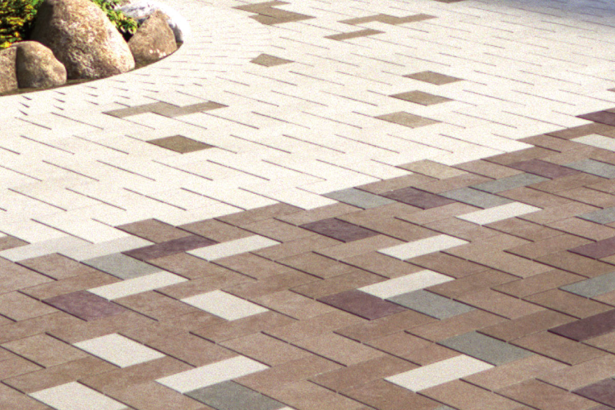 転回広場・一部土間スペースに透水性のインターロッキングブロックを採用。透水機能を持たせることにより、雨水が地中に浸透。水たまりができにくく、歩行が快適になります。