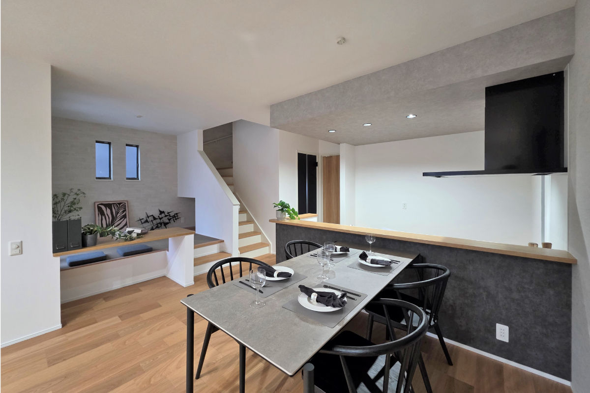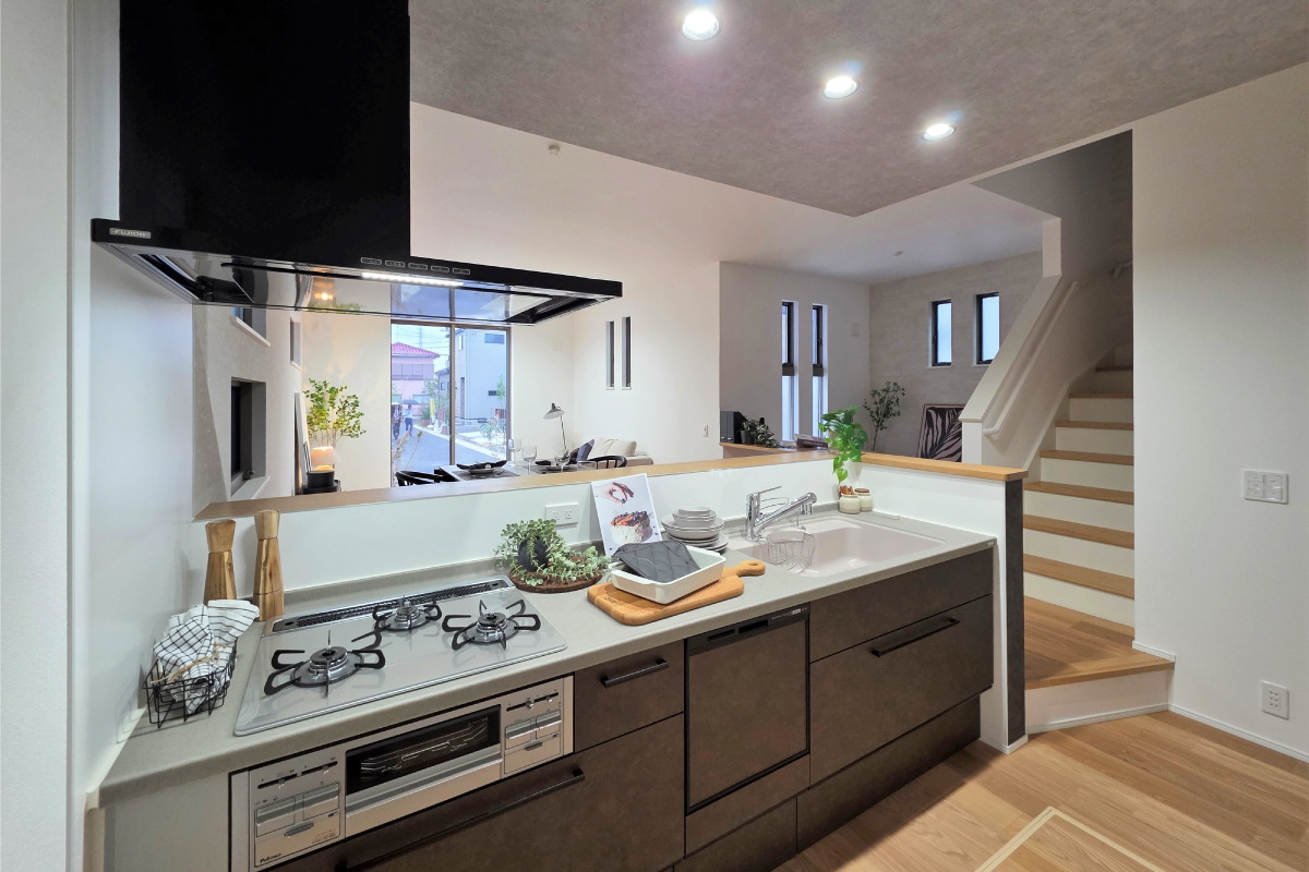 吊戸棚のないハイオープンなつくりと、対面カウンターで視界が広がる開放的キッチン。ダイニングにいる家族とおしゃべりしながら家事ができます。