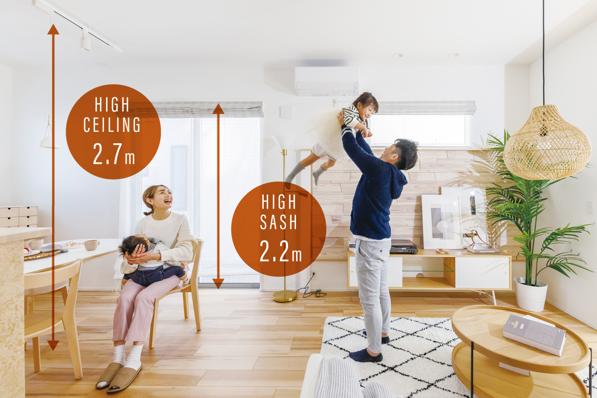 のびのびとゆとりをもって過ごせるようにリビング・ダイニングの天井高を2.7mに設定。子どもを肩車しても余裕のある高さです。掃出しサッシ高2.2mの広がりも開放感を与えてくれます。