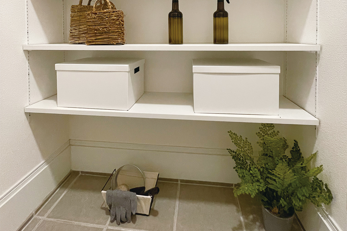 玄関脇にタイル敷きの収納スペースをご用意しました。屋内では汚れの気になるDIY用品や外遊びの道具、ベビーカーなどスペースを取る物の収納に便利です。