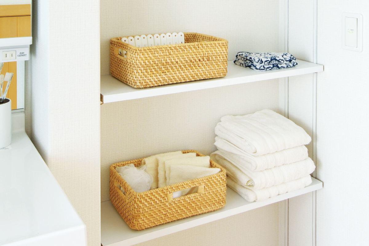 パジャマや下着を置ける収納スペースを洗面所内に設置。洗剤やシャンプーなどのストックもさっと取り出せて便利です。