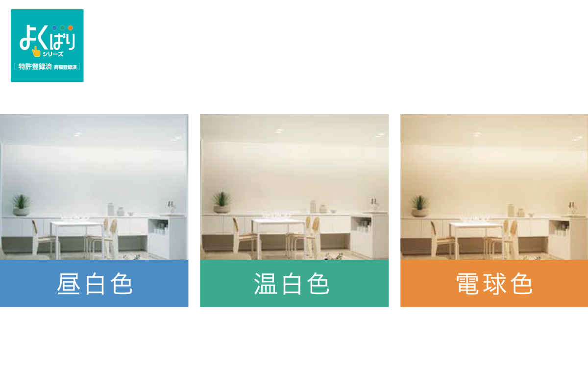 3つの色温度が楽しめるダウンライトをリビングとキッチンに採用しました。※ライトコントロール(調光器)はリビングにのみ採用