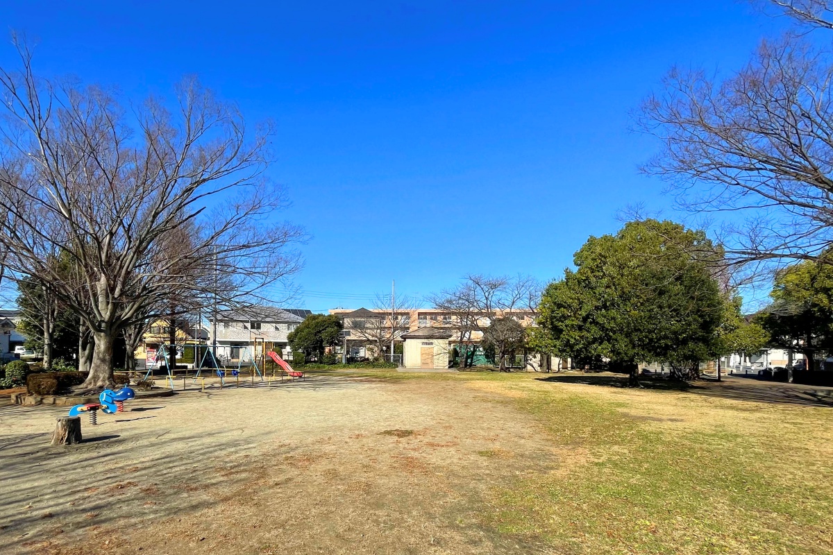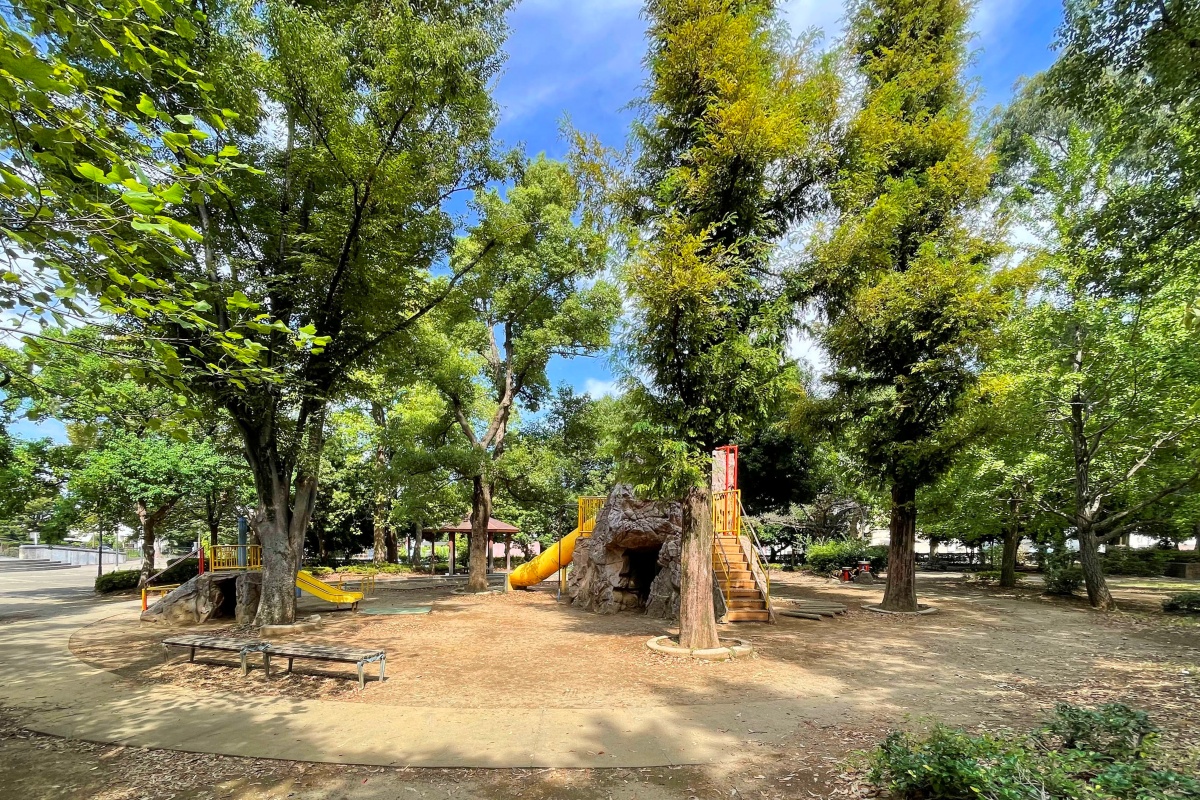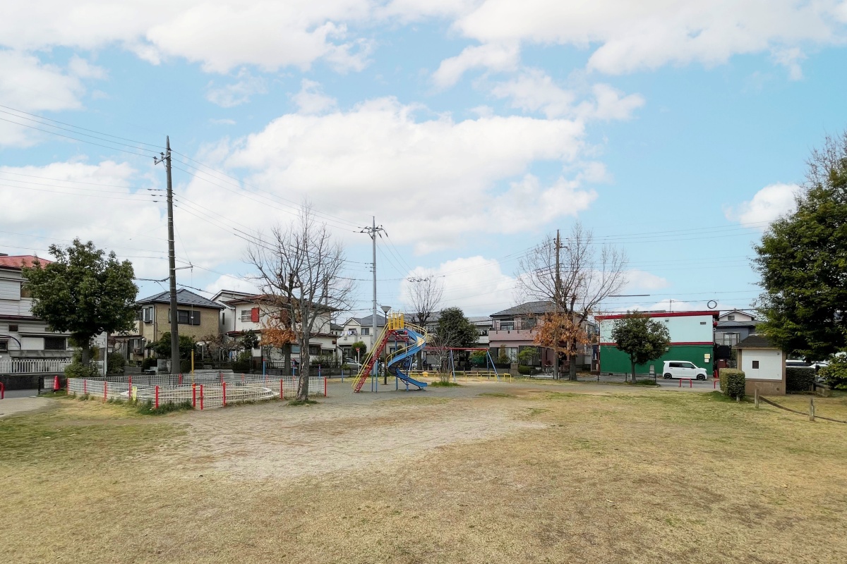らせん型のすべり台や鉄棒、ブランコなどの遊具が備わった公園です。砂場には動物の進入対策のフェンスが設けられているほか、屋根付きの休憩スペースもあり、親子で安心して過ごすことができます。