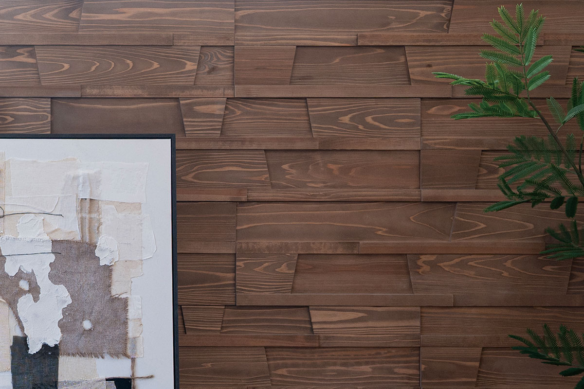 新潟県産越後杉の質感、香り等の特性を引き出したインテリアパネル。日本の大手ベッドメーカーが作る部材の半端材を活用しており、厚みや幅の異なる凹凸が、豊かな陰影を生み出します。フィトンチッドの働きにより、室内にいながら森林浴のような安らぎを感じられるのも特長です。また間伐材を使用することで林業の活性化と森林の保守を支えています。