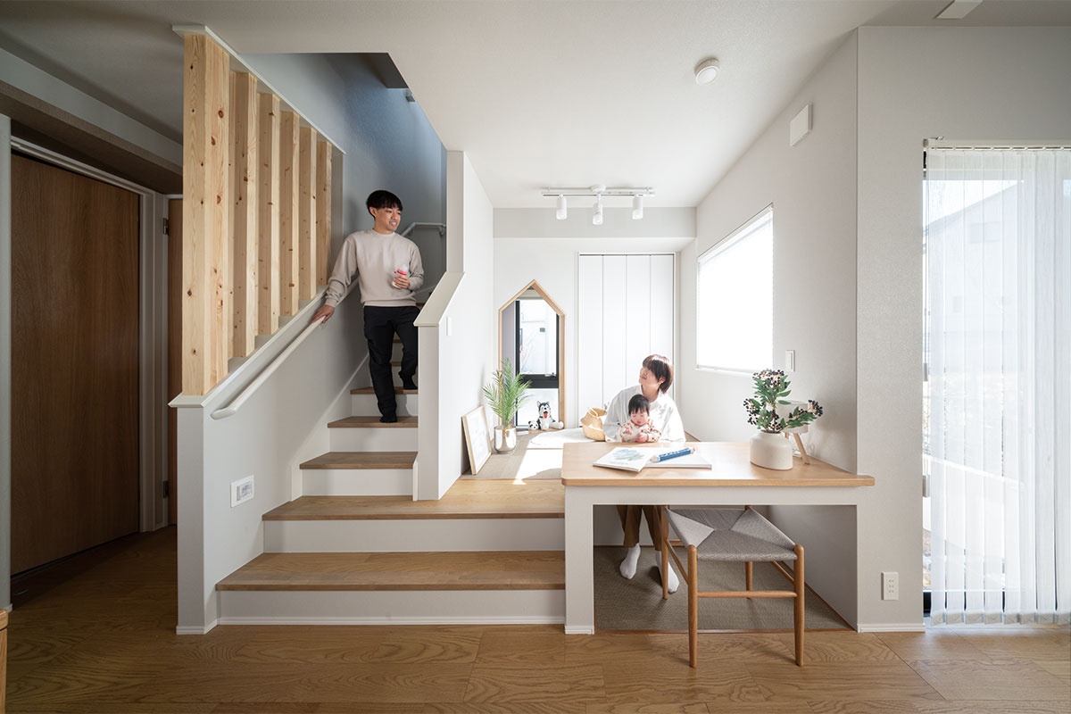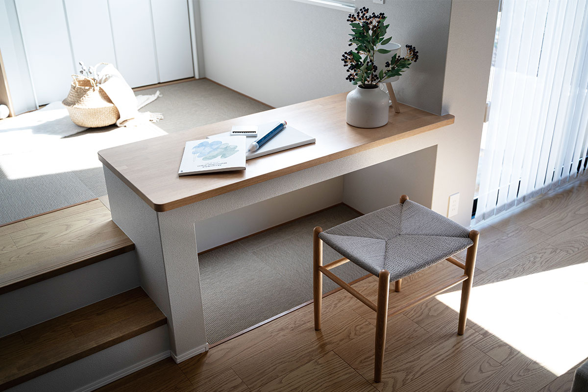 リビングの一角を小上がりにしたステージリビング。開放感をそのままに空間をゆるやかにゾーニングすることで、リビングやキッチンにいる家族の気配を感じながら、仕事や勉強、趣味などの自分時間を満喫できる心地良い段差空間です。