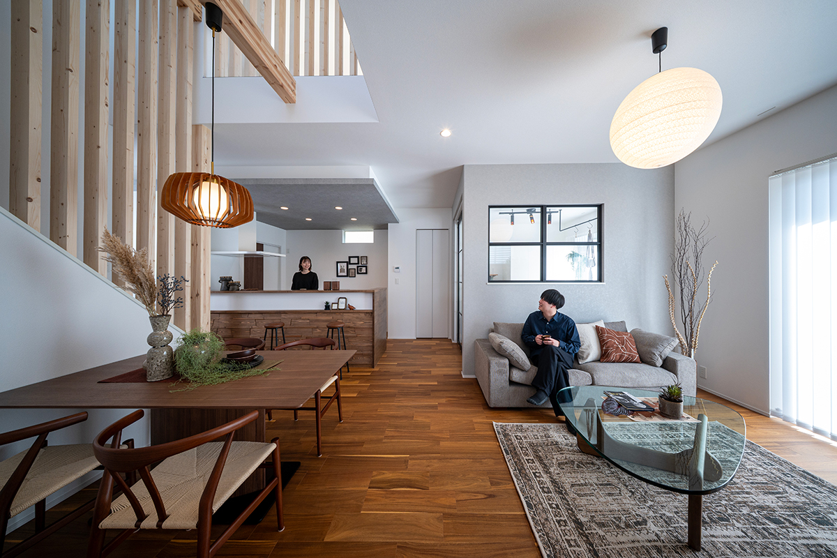 それぞれ別の場所で過ごしていても家族の存在を感じられる見晴らしの良さとともに程よい独立性を叶える段差空間。個性的な空間に映える壁材「the wall」がアクセントとなり歳月とともに味わいを深めていける住まいです。