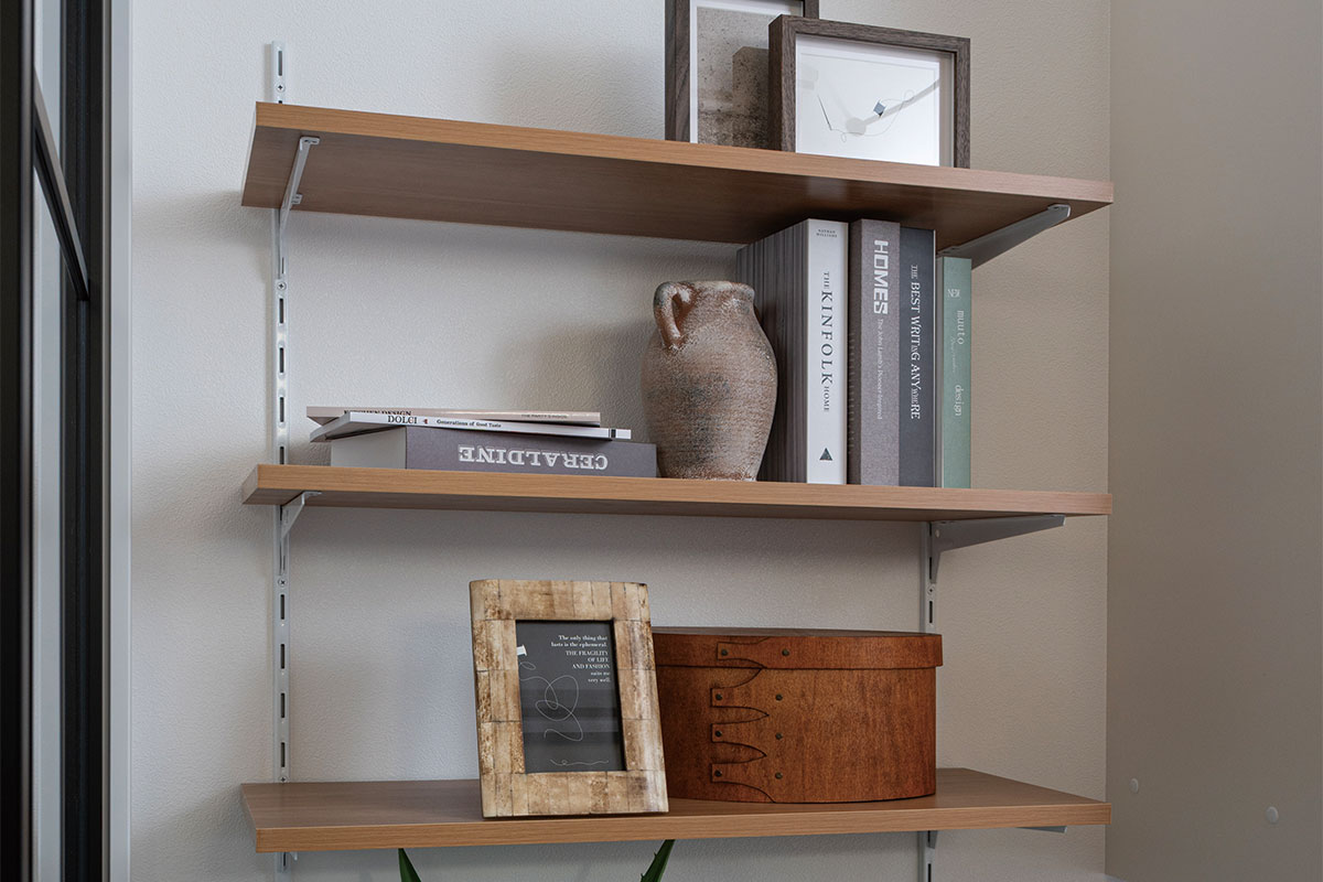 棚板の高さを自由に変えられ、本や雑貨、お気に入りのものを自分好みに並べられます。