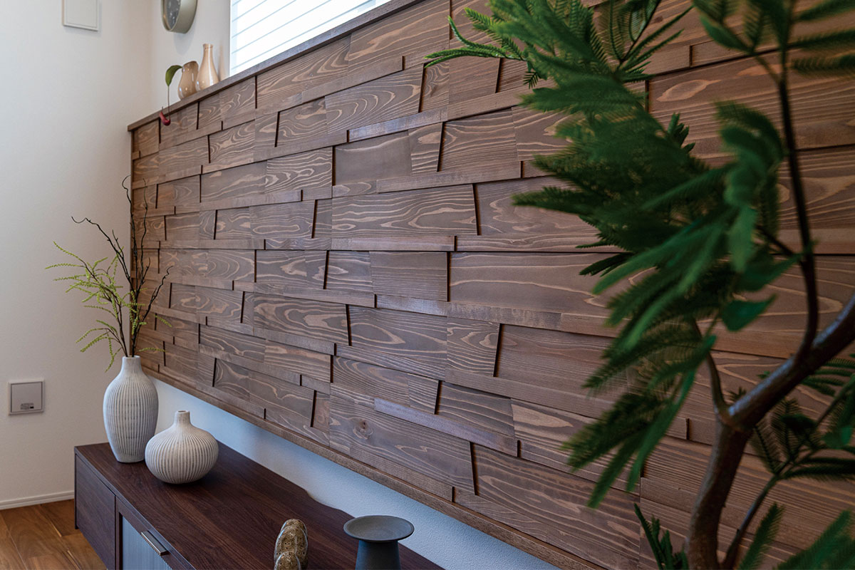 リビングの壁またはキッチン腰壁に採用。凹凸が織りなす複雑な陰影と、呼吸する無垢材が清々しい香りを放ちます。