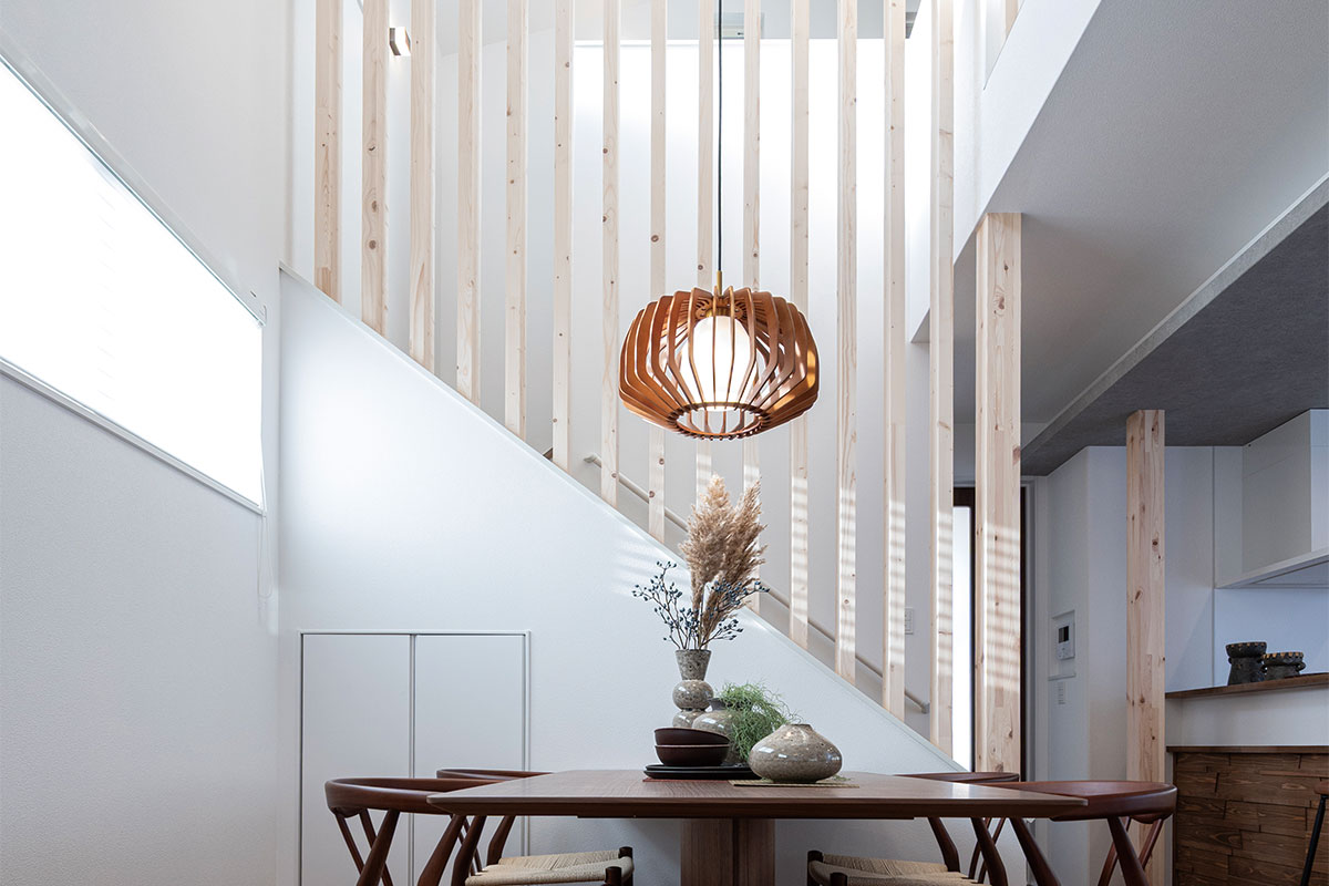リビング階段の側面に設けた木目調の格子。視線を程よく遮りながら、モダンなデザインで柱や梁をあらわした日本家屋のような雰囲気をプラスしてくれます。