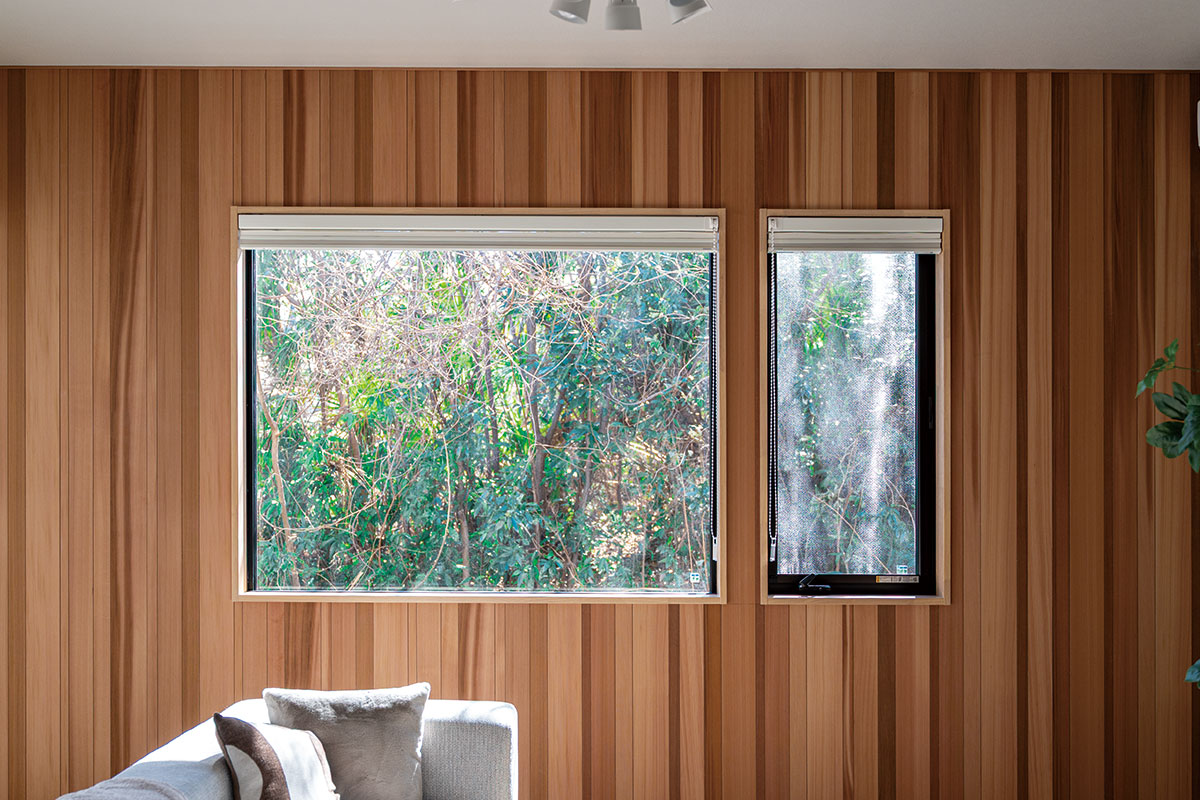 自然の中で育ってきた天然木が持つ個性豊かな色の濃淡とキャラクターを活用した壁材をアクセントとしてリビング壁の一面に採用。窓から望む緑を借景として室内に繋げ、家にいながら森の中にいるような、奥行きのある空間を演出しました。