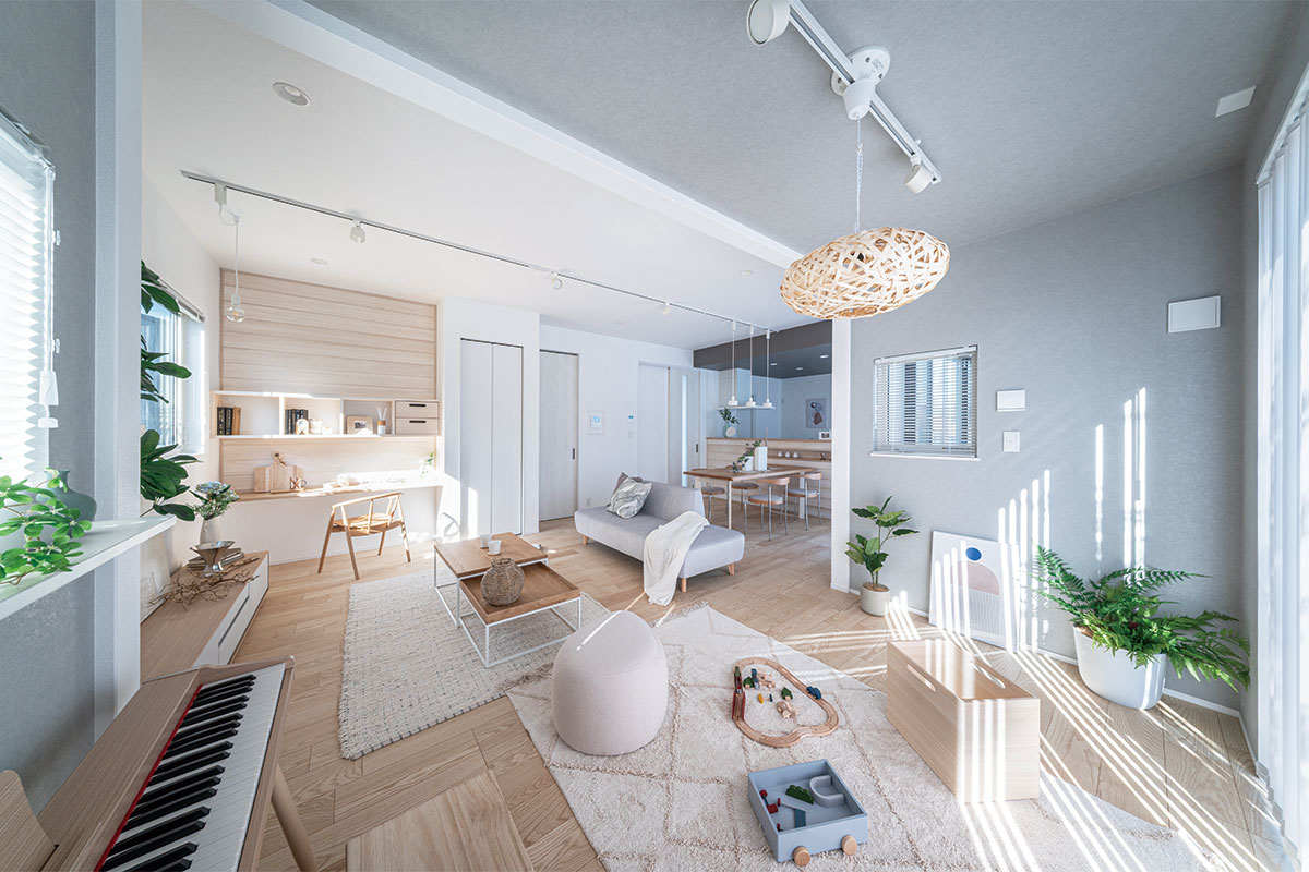 たっぷりの陽光を取り込むリビングに木のインテリアを配置。森のようなあたたかなリビング・ダイニングの隣には家族の成長や生活の変化にも対応する空間をレイアウト。アイデア次第で暮らしが広がる住まいです。