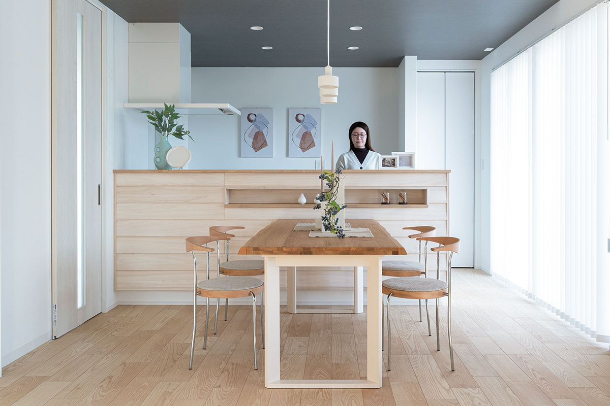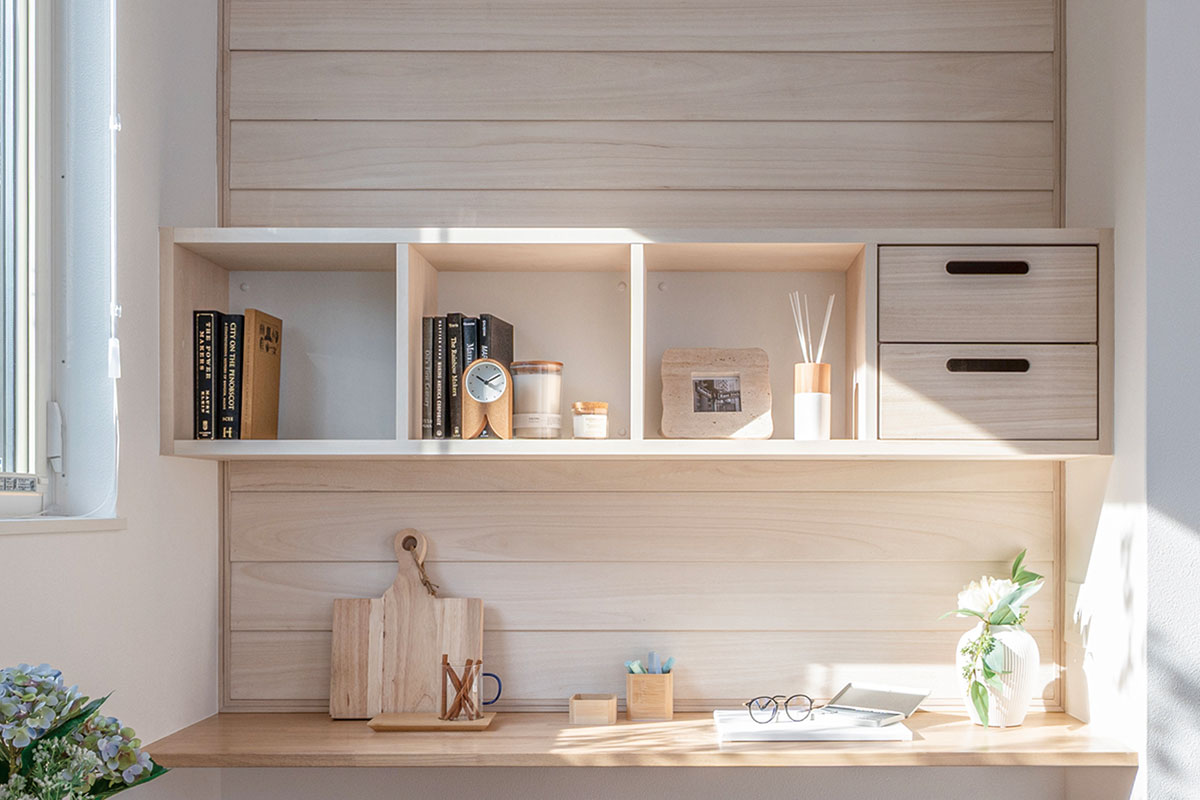 リビングには便利なスタディカウンター、シルキーウッドと共材のフロートシェルフを設けました。家事の合間にほっと一息つくミセスカウンターや、家族を見守りながらリモートワークをするのにも便利です。