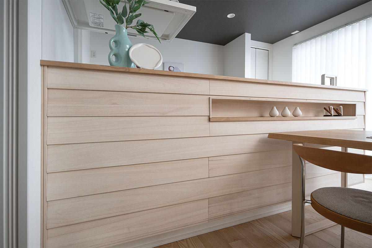 リビングの一角とキッチン腰壁に桐材を自然派オイルステインで仕上げたシルキーウッドを採用。木目のやわらかな質感のある手触りなど、桐素材の魅力を感じられます。