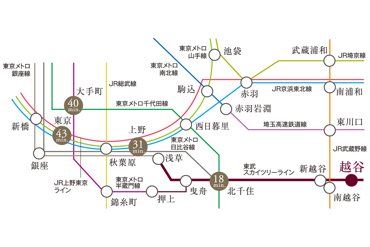 ※電車の所要時間は、朝のラッシュ時間帯のものになります。乗換・待ち時間を含んでいます。