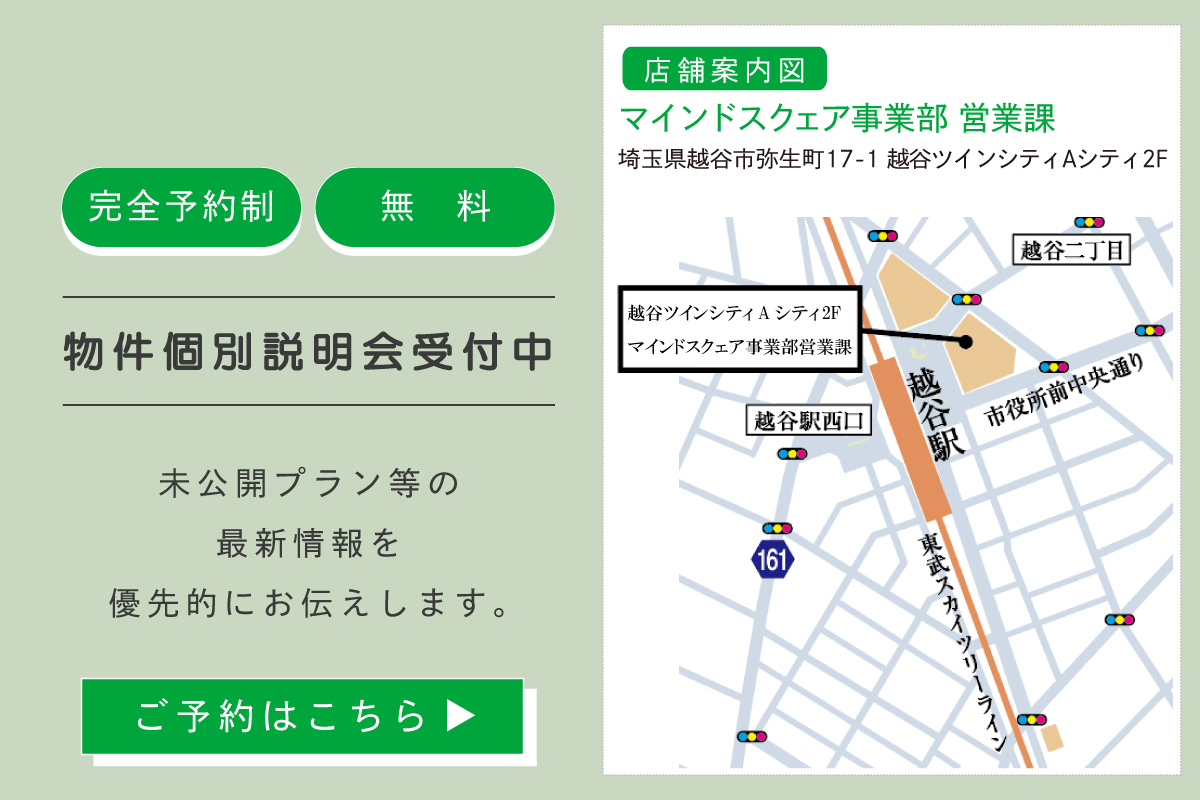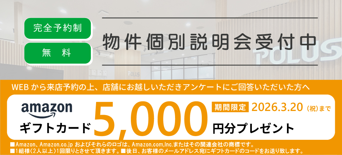 未公開プラン等の最新情報を優先的にお伝えします。完全予約制となりますので、お早めにご予約ください。店舗所在地:埼玉県越谷市弥生町17-1 越谷ツインシティAシティ2F【来店予約特典】Amazonギフトカード5,000円分をプレゼント!※Webサイトから「来店予約」された方で、店舗にお越しいただきアンケートにご回答頂いた方に限ります。※本キャンペーンは、株式会社中央住宅 マインドスクェア事業部による提供です。本キャンペーンについてのお問い合わせは、Amazonではお受けしておりません。※本キャンペーンに関するお問い合わせは、株式会社中央住宅 マインドスクェア事業部(0120-350-255)までお願い致します。【キャンペーン期間:2026.3.20(祝)まで】