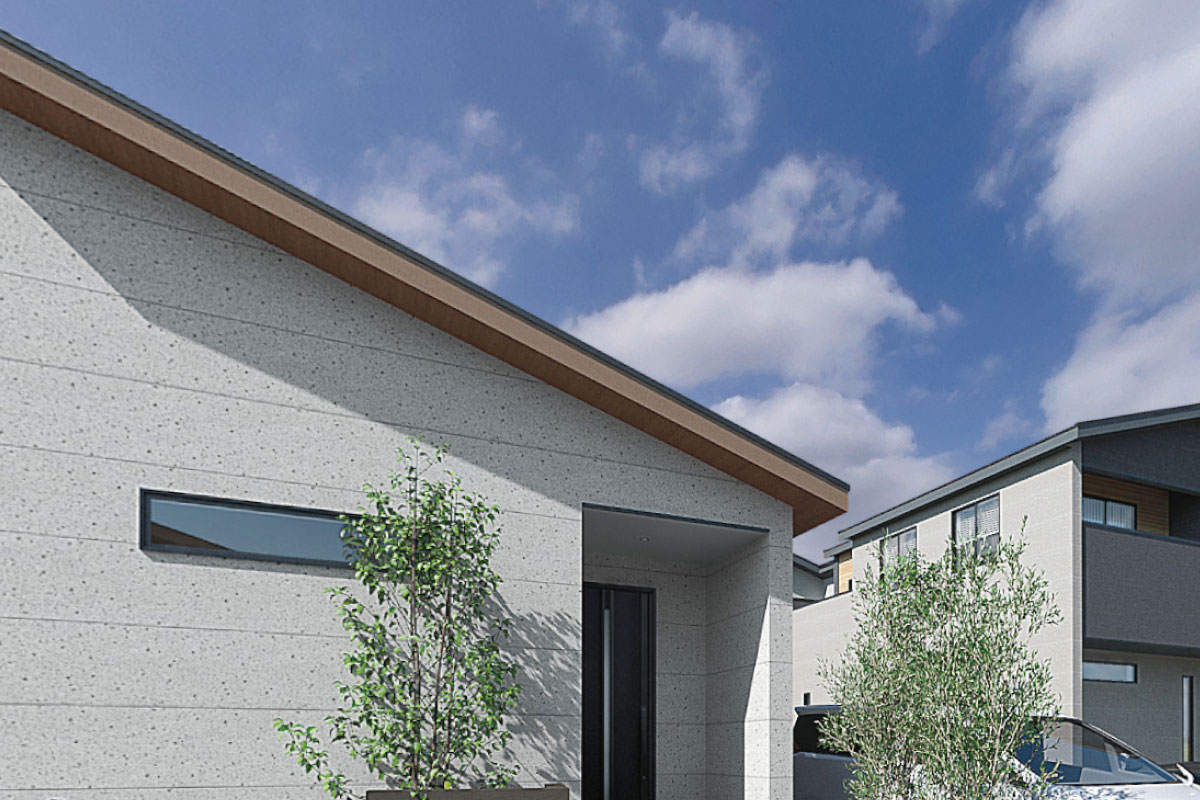 建物全体のシルエットが目に止まり、デザイン性の高さがひと際映える平屋。奥行きのある造形がその表情を豊かに仕上げて、静かに存在感を伝えています。