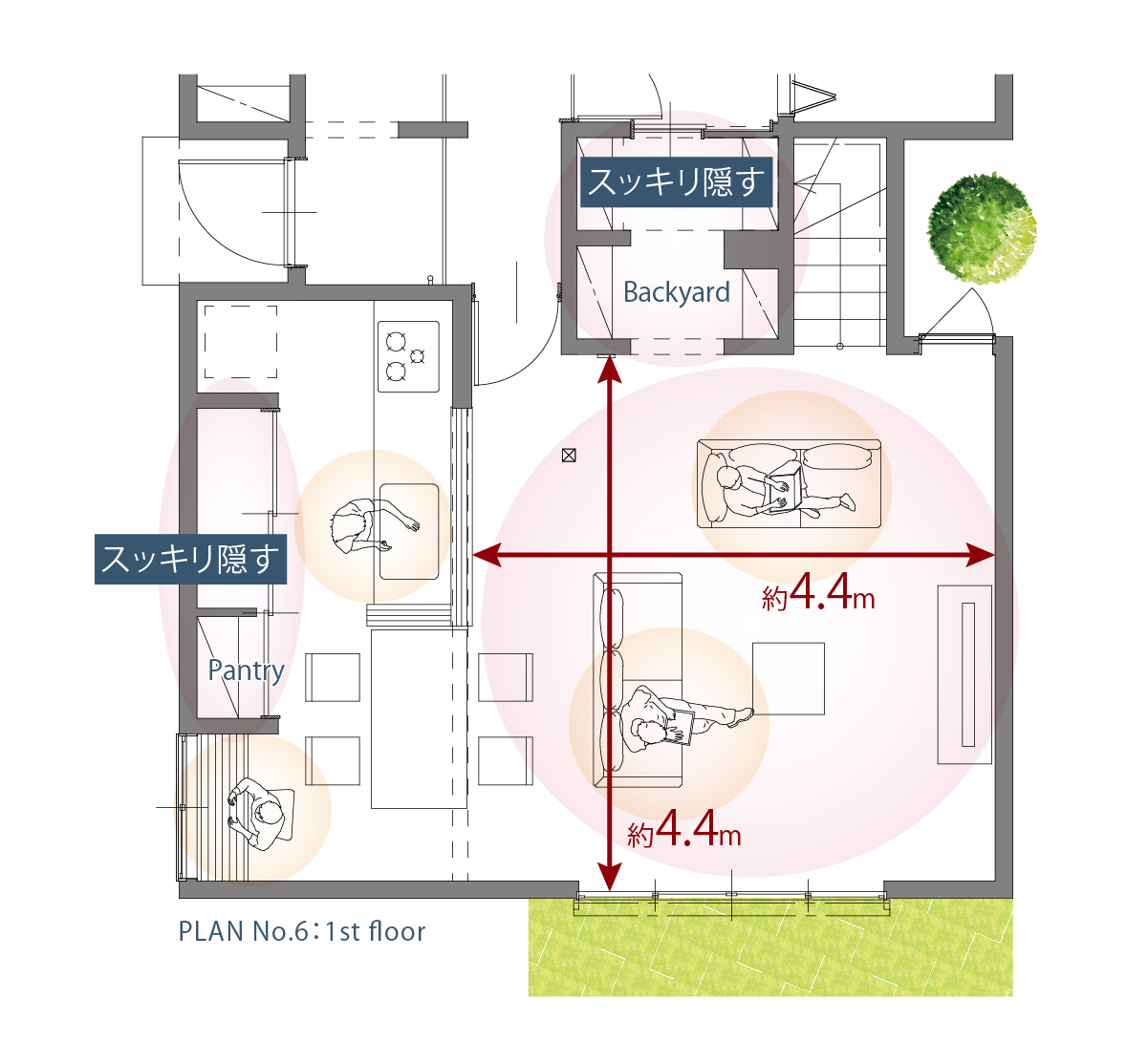 さらに、大容量のバックヤードや、扉付のワイドパントリーで収納物をスッキリ隠すことで