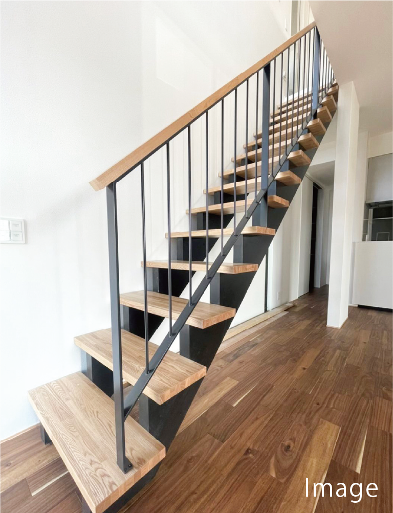 スタイリッシュなデザインと温かな質感を併せ持つ木製ストリップ階段を採用。