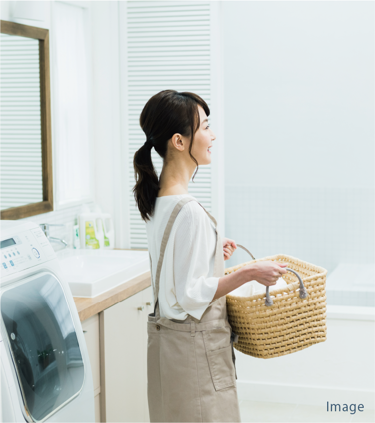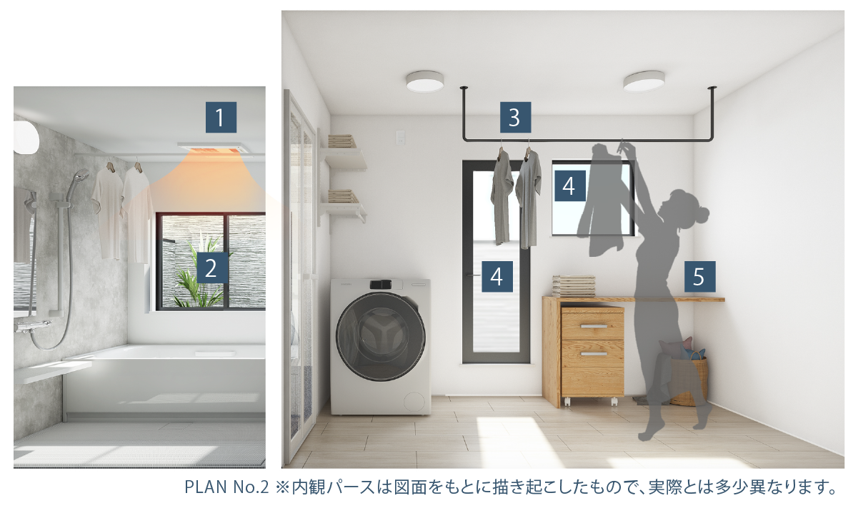 浴室の隣に家事スペース付の洗面所を配置。洗濯物を効率良く干せ、