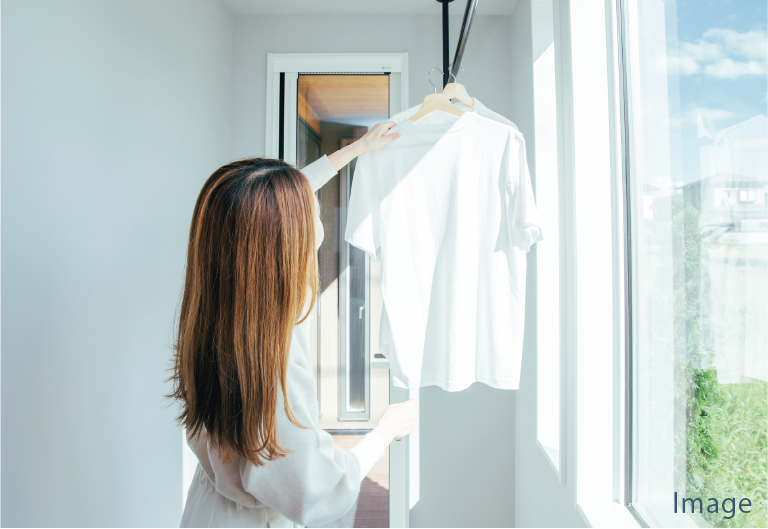 室内物干し金物、自然光を取り入れる開放的な窓、整理上手な可動棚などを備えたスペースを確保。家事をスムーズにこなすことができます。