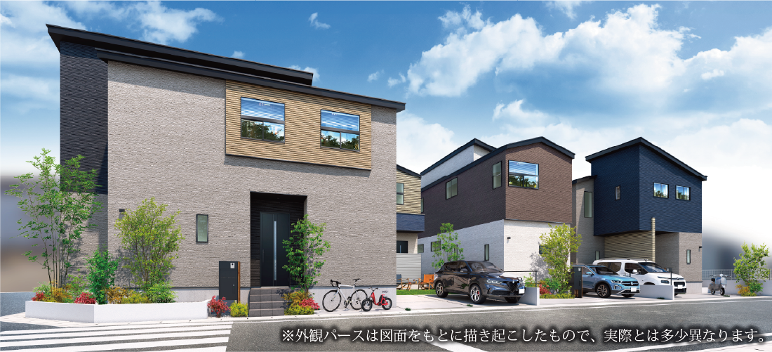 広い前面道路に面した、敷地面積110㎡超の4邸。アースカラーをベースにした落ち着いた街並み。