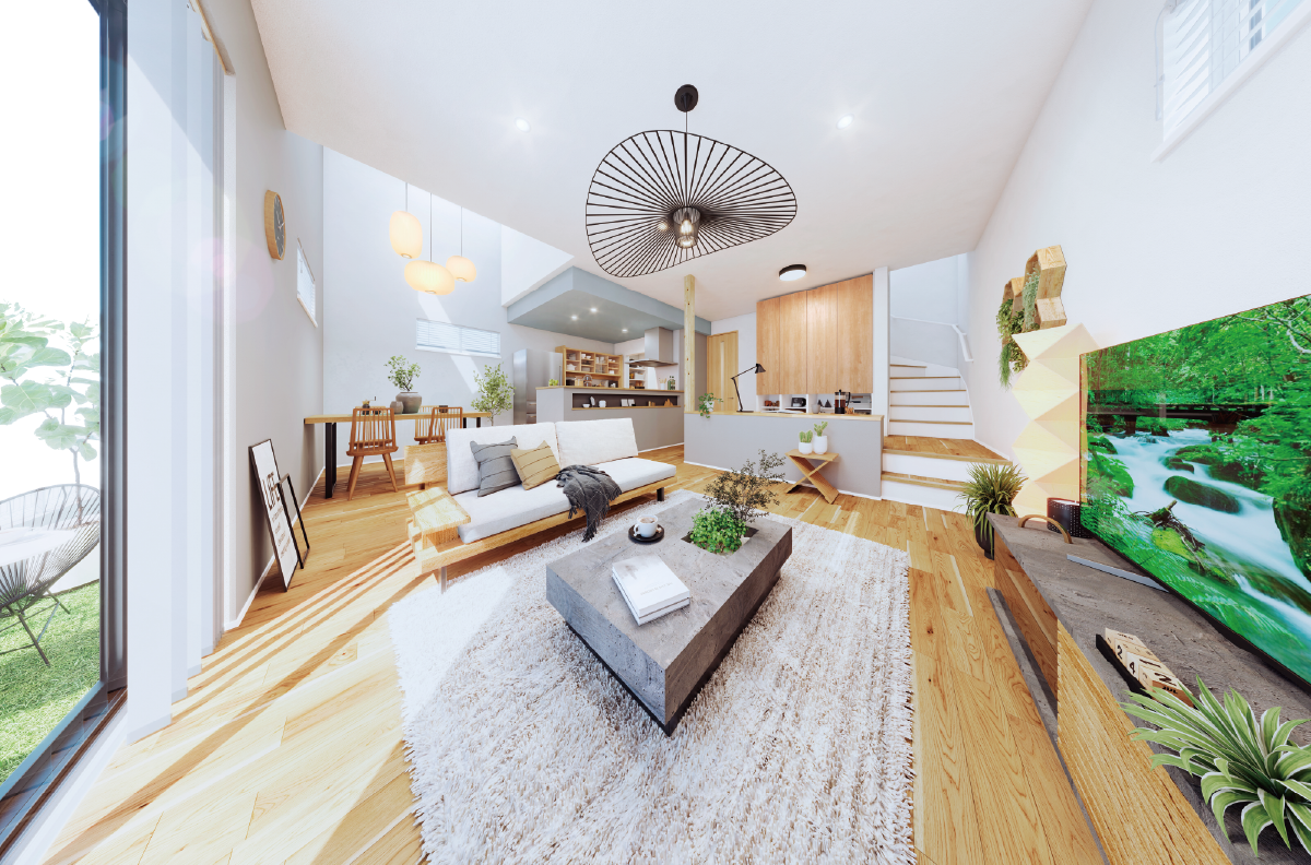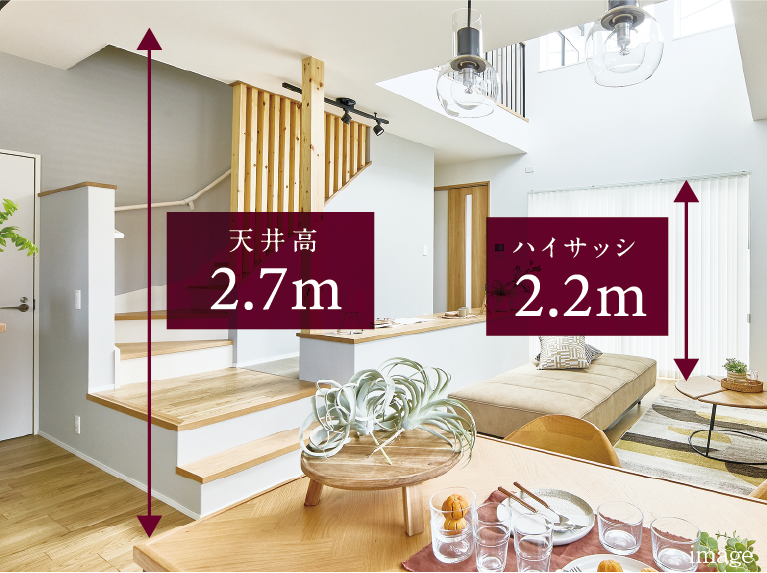 天井高2.7m、サッシ高2.2mの縦の空間の広がりが開放感を演出。家族揃ってのびのびと寛げる、ゆったりとした団らんの時間をうみだしてくれます。