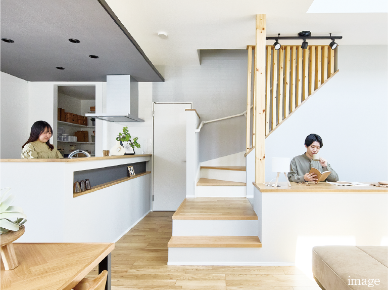 料理をしながらリビングの家族の様子を眺めたり、会話を楽しめる対面キッチンを採用。家事をしていても家族を身近に感じられます。