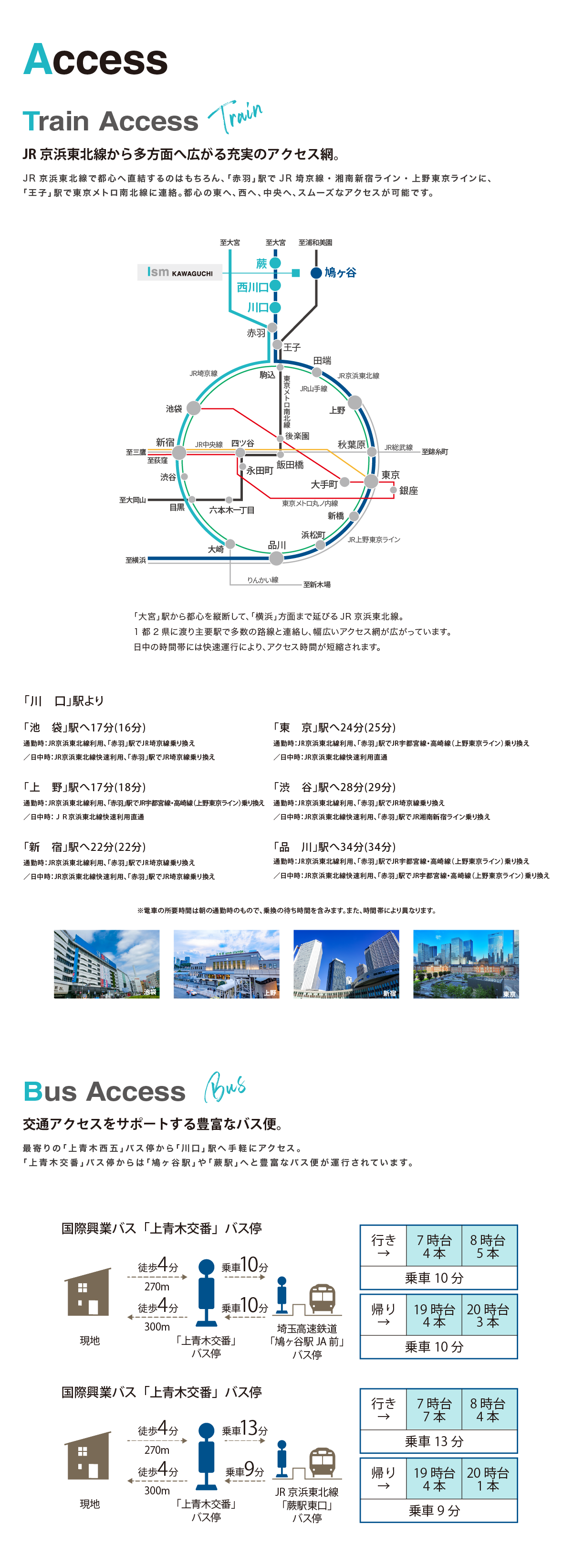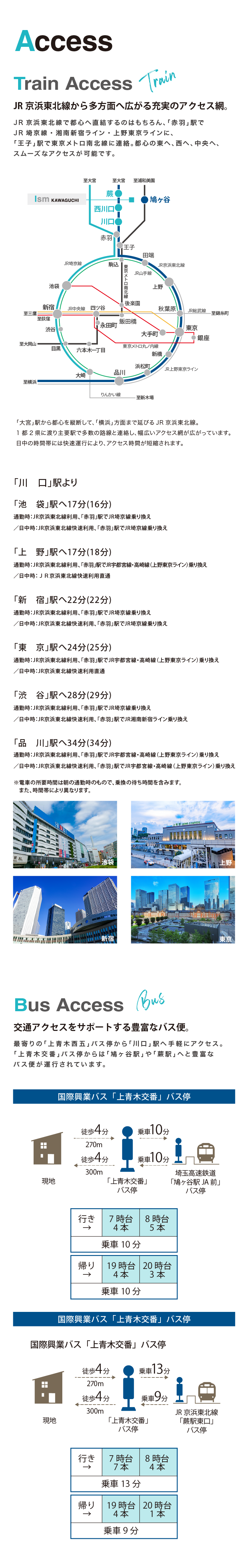アクセス ●川口駅より赤羽駅まで【ラッシュ時: 3分 京浜東北線(桜木町行)利用。】【平常時: 3分 京浜東北線快速(大船行)利用。】