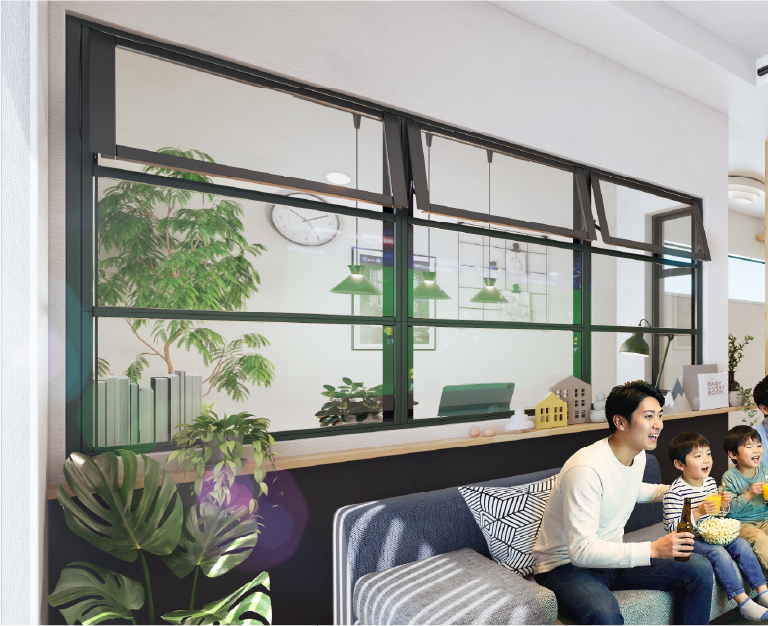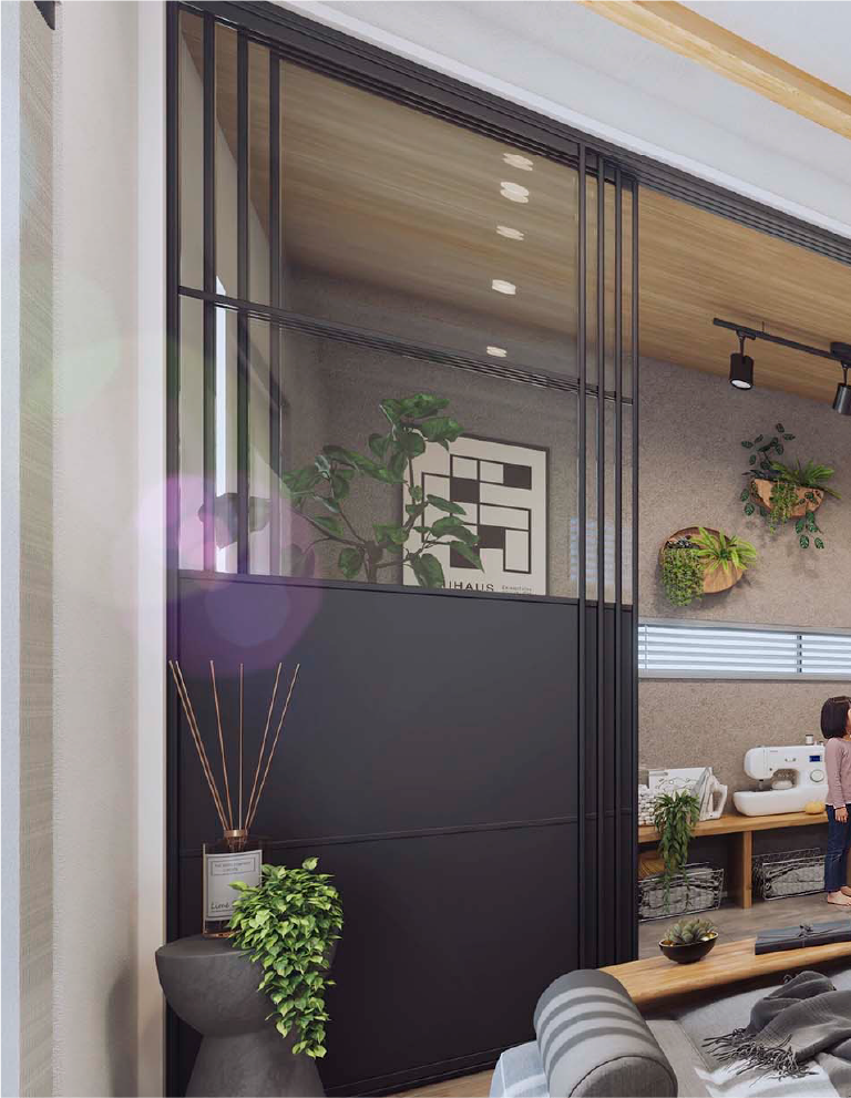 アトリエルームを間仕切りできる4枚引戸は、上部2枚が奥行きが見える透明パネルで、下部2枚が趣味の空間をしっかり分けるおしゃれなブラックパネル。