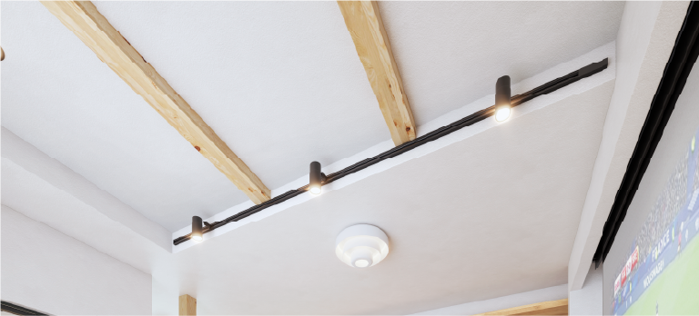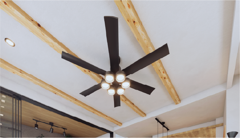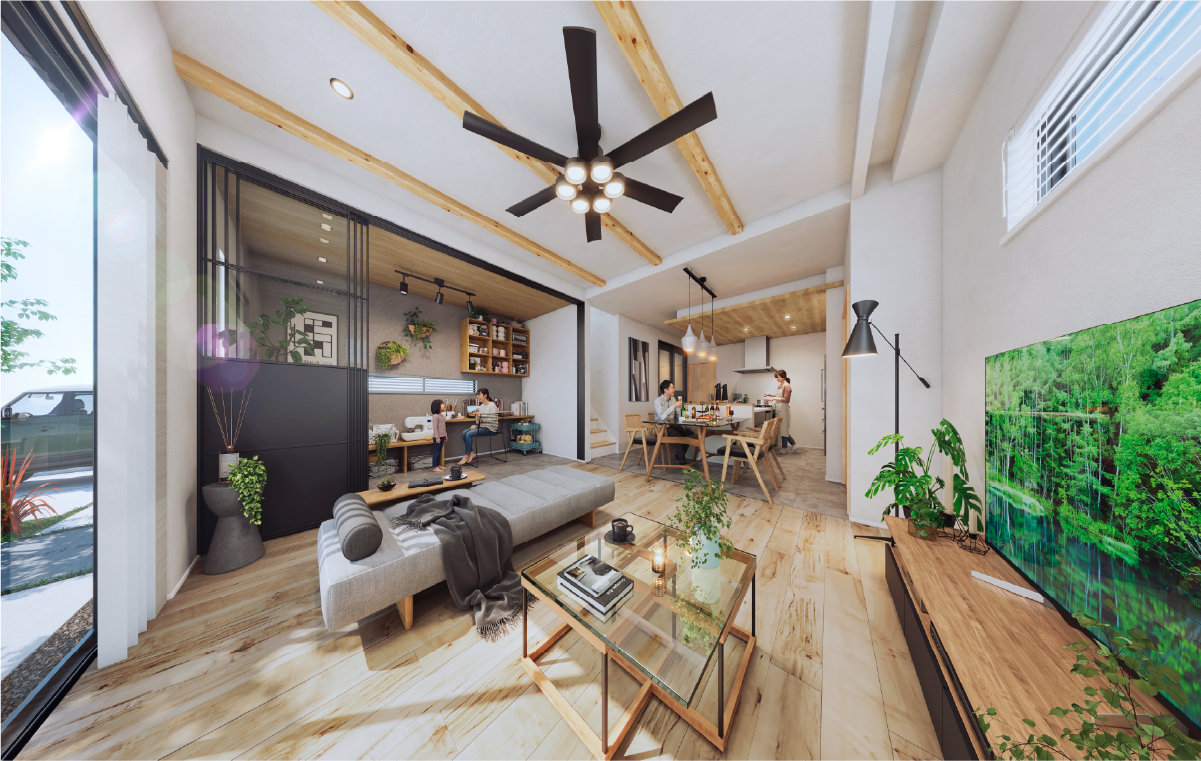木の温もりを感じる化粧梁と、質感を愉しむブラックアイアン。スポットライトが描く光と影で、日常をドラマチックに演出します。