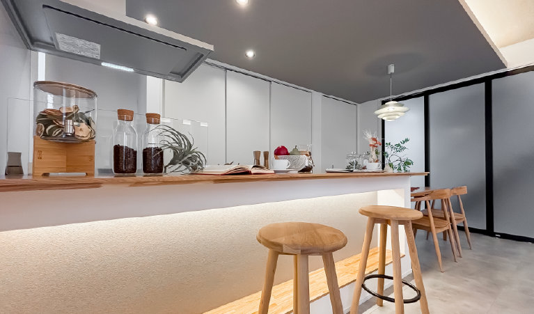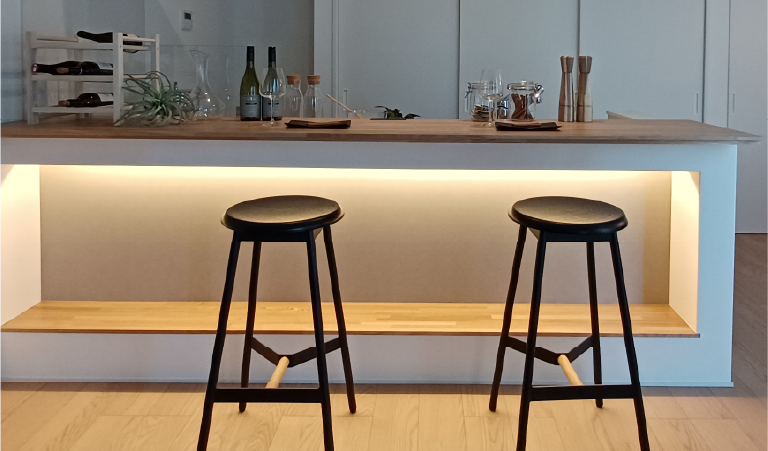 影をデザインし、空間を立体にする。優れたインテリアに欠かせないのは、あえて「照らさない」という美学。バーカウンターの下を仄かに照らす、造作の間接照明が、床材の質感を浮き彫りにし、キッチンに圧倒的な奥行きを与えます。
