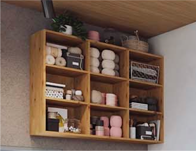 毛糸や、こだわりのリボン、お気に入りのリネンなど、常に在庫が視界に入り、綺麗に収まるおしゃれな吊り本棚です。