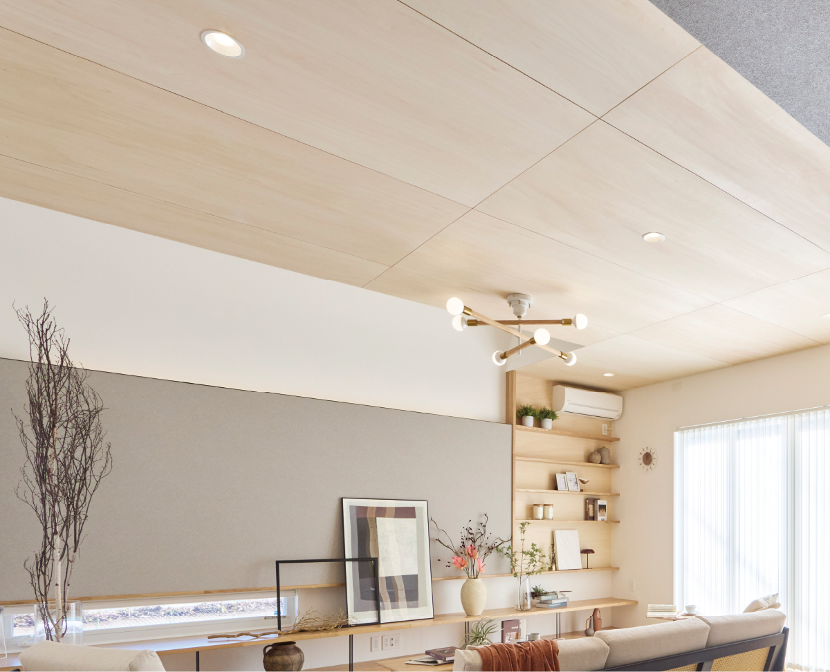 天井には滑らかな質感を持つ無塗装のシナ合板を採用。