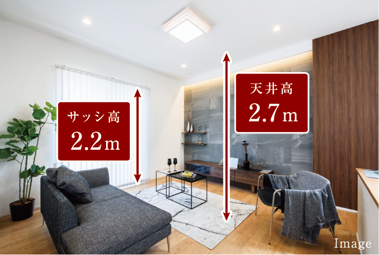 天井のゆとりの高さを持たせたほか、サッシも大枠で設定することで、視界が開けた開放感あふれるLDK空間を創出しました。