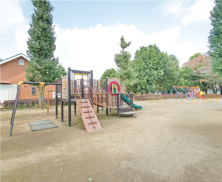 豊富な遊具に水遊び場を備えた地区を代表する公園。春には桜、秋には銀杏が彩りを添え、中央広場では夏祭りも開催されます。